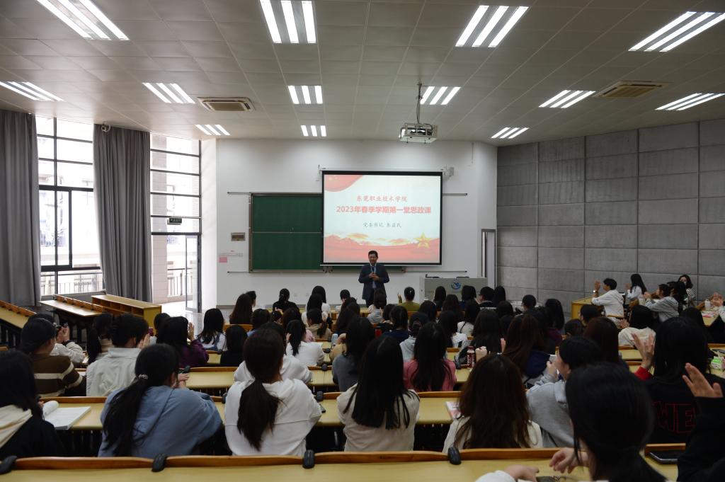 校党委书记朱益民以《开创高质量发展新局面》为题为22级学前2、3班的同学们上了一堂内涵丰富的开学思政第一课。朱益民以习近平总书记在党的二十大报告中提出的“高质量发展是全面建设社会主义现代化国家的首要任务”引出课程内容,他结合东莞发展和学校建设深入浅出的讲述了什么是高质量发展,怎样做到高质量发展。他表示,要立足新发展阶段,以高质量发展为主题,把新发展理念贯穿发展全过程和各领域,不断破解发展难题、增强发展动力、厚植发展优势,加快构建新发展格局,中国经济定能在高质量发展的道路上不断书写新篇章,迎来更加光明的美好前景。