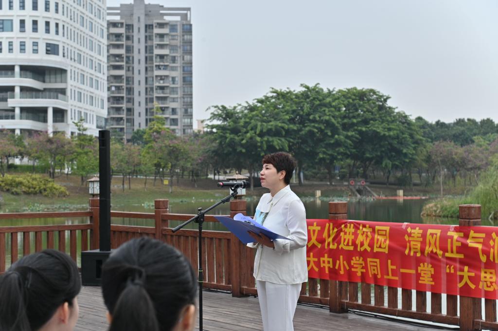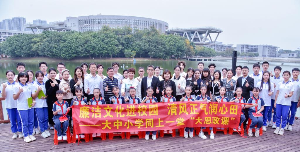 2023年12月13日下午,在我校新落成的清风园里,我校与东莞中学松山湖学校、厚街前进小学联合举办“廉洁文化进校园清风正气润心田——大中小学同上一堂‘大思政课’”活动。我校党委书记司琪、党委副书记、纪委书记蔡东宝,党政办公室、党委宣传部、纪检室、马克思主义学院相关负责人,东莞中学松山湖学校、东莞市厚街前进小学指导老师以及我校马克思主义学院部分教师参加了本次活动。