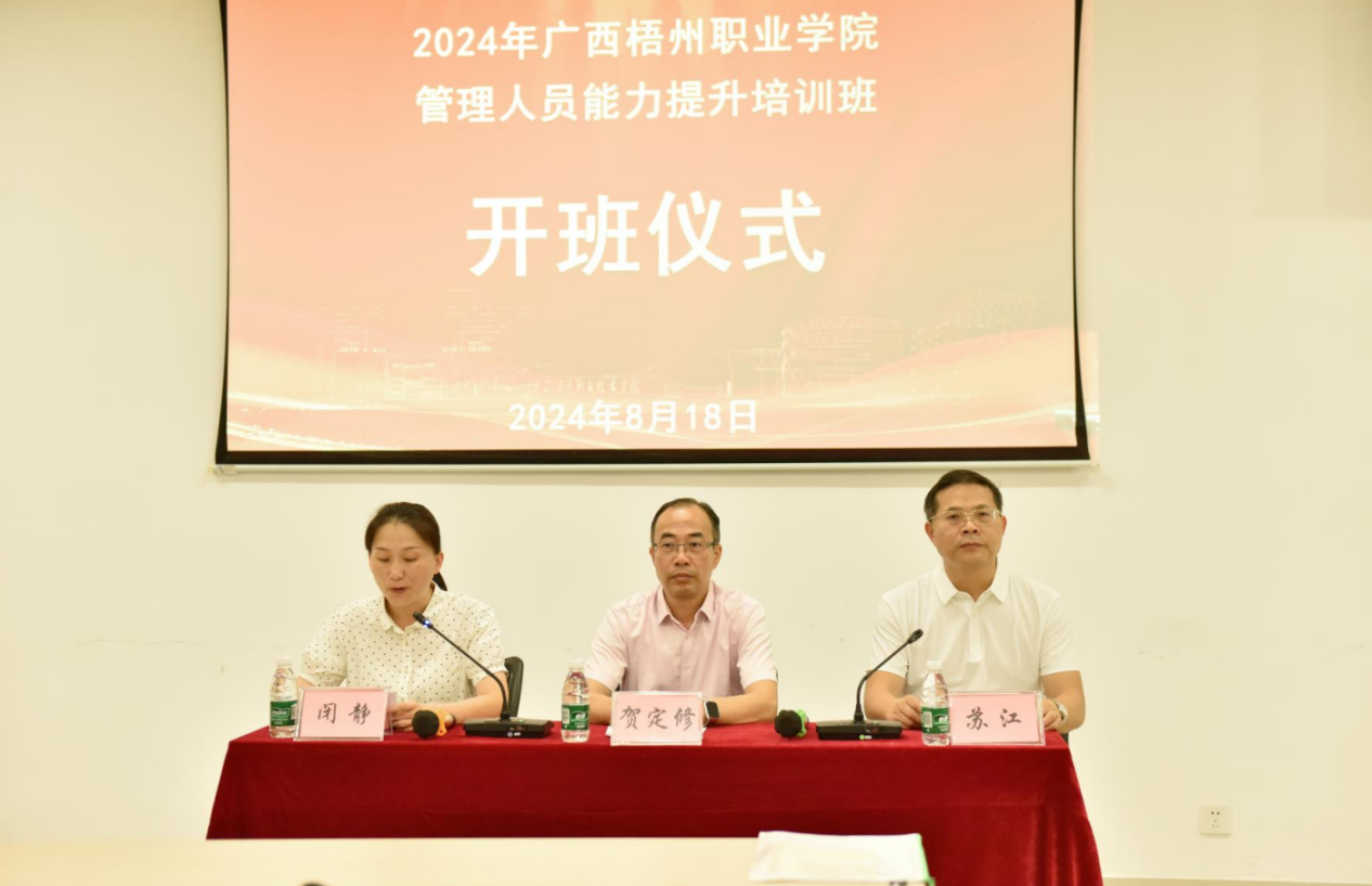 8月18日下午,2024年广西梧州职业学院管理人员能力提升培训班在我校开班。我校党委副书记、校长贺定修,继续教育学院(社区学院)院长苏江,梧州职业学院教学科研处副处长闭静出席开班仪式。梧州职业学院56名管理人员参加培训。