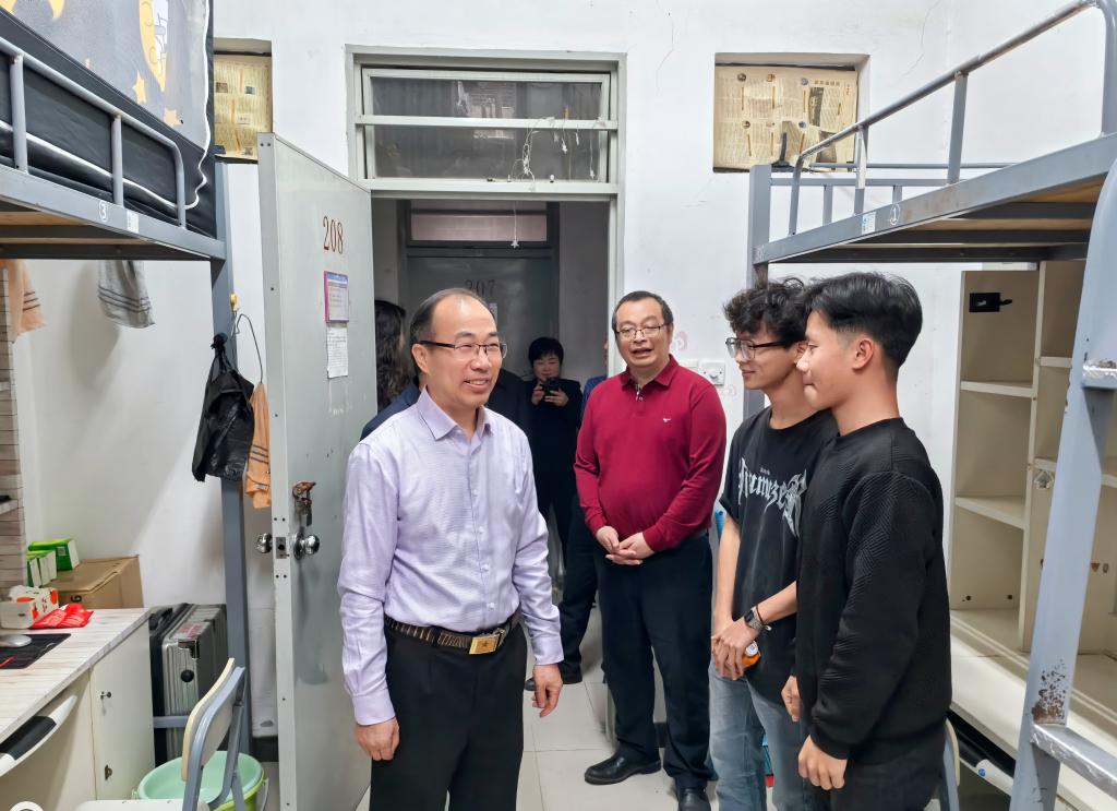 检查组首站来到学生食堂,重点查看后厨卫生、食材储存及留样管理情况,详细询问菜品价格和供餐流程。司琪书记强调要严把食品安全关,确保学生“舌尖上的安全”。随后,检查组走进学生宿舍,实地检查宿舍卫生、水电设施,贺定修校长与同学们亲切交流,详细询问他们的学习生活和思想动态等方面的情况,并要求宿管人员加强出入管理,营造安全、整洁的住宿环境。在消防控制室,校领导认真查阅设备巡检台账,现场测试火灾报警系统响应速度,强调要定期组织消防演练,筑牢校园安全防线。