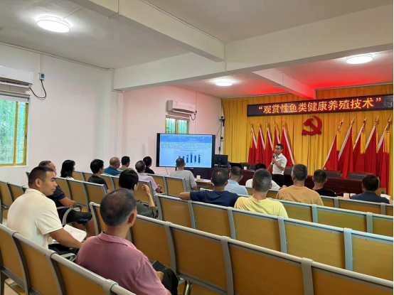 项目组成员对渔民开展了两场培训,主题分别是“观赏鱼健康养殖技术”和“淡水池塘草鱼养殖技术”。