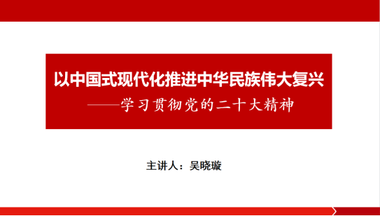 吴晓璇同志以“中国式现代化推进中华民族伟大复兴”为主题,深入浅出的对党的二十大报告内容进行解读和宣讲。通过本次宣讲会,我院师生对党的二十大精神有了更加深刻全面的理解,大家纷纷表示,未来要更加紧密地团结在以习近平同志为核心的党中央周围,以党的二十大精神为指引,踔厉奋发,努力前行。